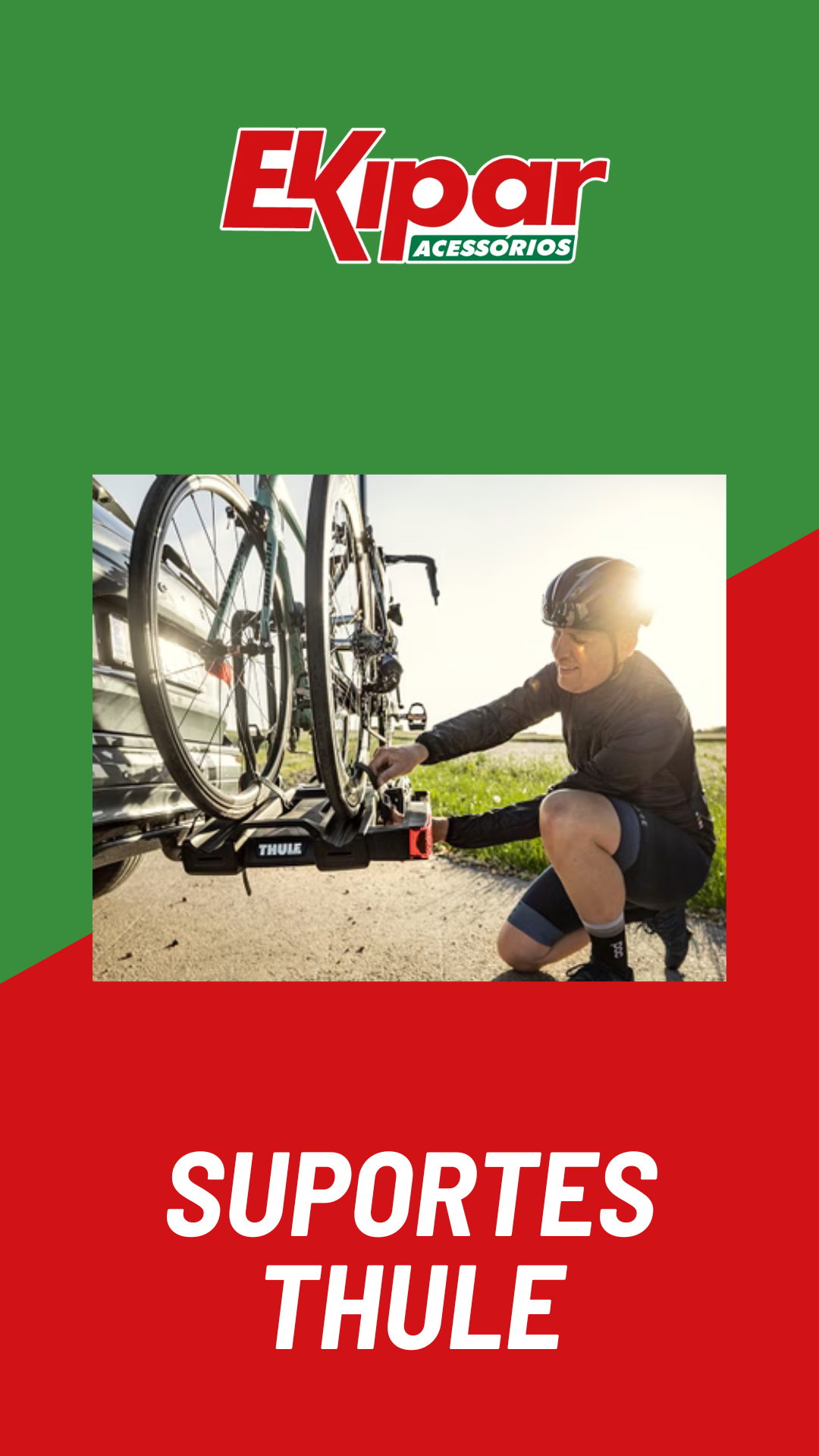 Linhas originais de suportes Thule para bicicletas e bagageiros, ideais para viagens e esportes.